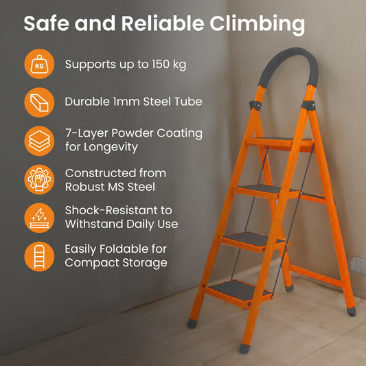 Cheston Foldable GI Steel 4-Steps Home Ladder | 4.8 Feet Anti-Skid Step Ladder with Wide Pedal & Hand Grip | Shock-Resistant Foldable Ladder for Home Use | Supports 150+ Kgs | Orange 4 Step