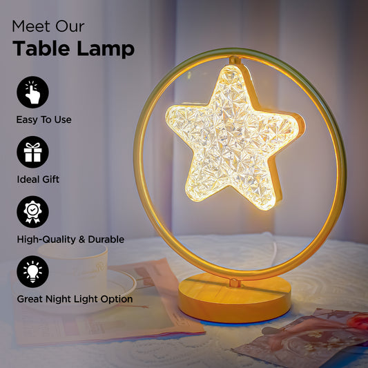 Dimmable Table Lamp for Bedroom | 29 Cm Height| Wood Base with Acrylic Shade | Table Lamp for Study | House Warming Gift for New Home| Home Decor Items for Living Room - Star Shaped