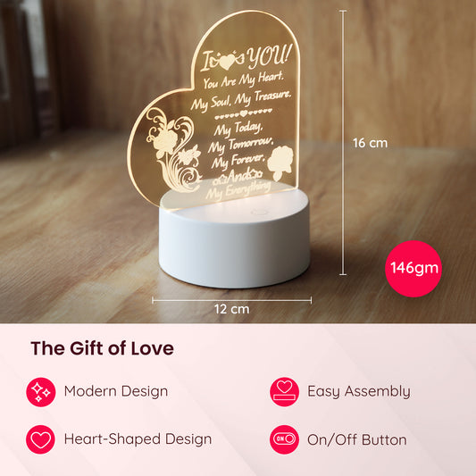 Heart Engraved Acrylic Night Light - Adjustable Brightness | Includes Stand | 11.9 cm x 13.3 cm | Transparent