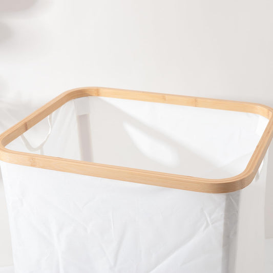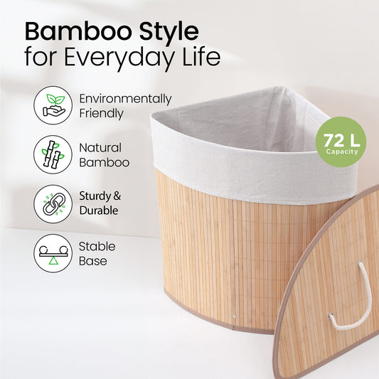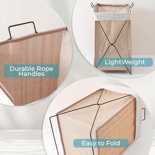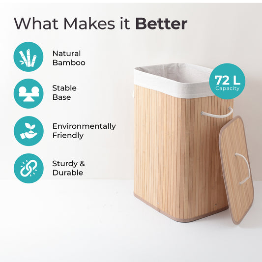 Bamboo Basket With Lid 72 Litres | Foldable Laundry Basket For Clothes | Durable Rope Handles & Removable Bag (Natural)