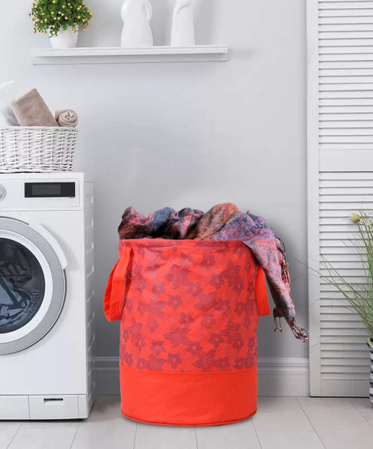 Heart Home Laundry Organiser with Handles|Metalic Flower Print & Foldable|Size 37 x 37 x 47 CM, Capicty 45 LTR (Red)-HEART12054