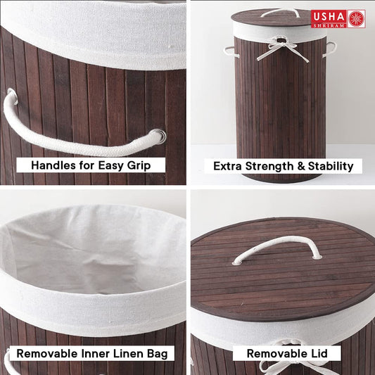 USHA SHRIRAM Foldable Bamboo Laundry Basket With Lid | Sustainable & Eco-Friendly | Travel Essential | Solid Laundry Basket (35cmx35cmx60cm) | Easy To Carry (1 Pcs, Dark Brown)