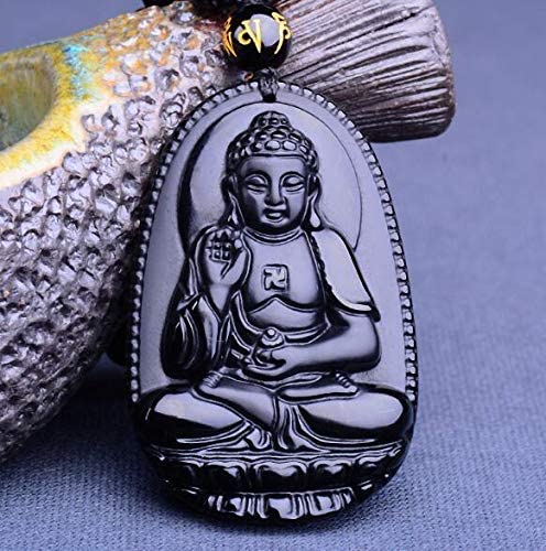 Long Buddha Pendant Necklace - Natural Black Obsidian | Unisex | 39 cm | Black