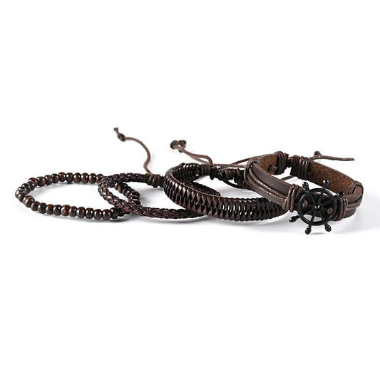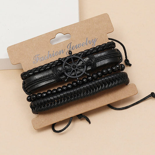 Combo: Leather Bracelets for Men | 4 Adjustable Wraps | Black