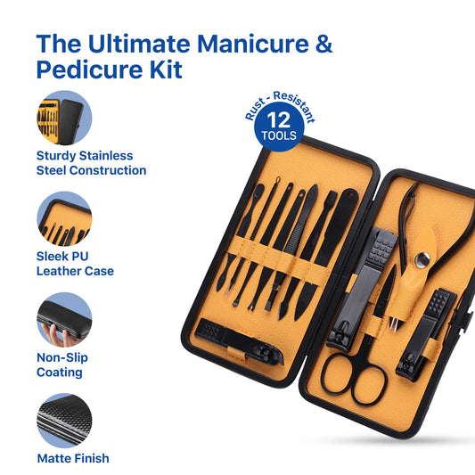 12 in 1: Manicure & Pedicure Kit with Stainless Steel Tools | Complete Grooming Set | Elegant Black