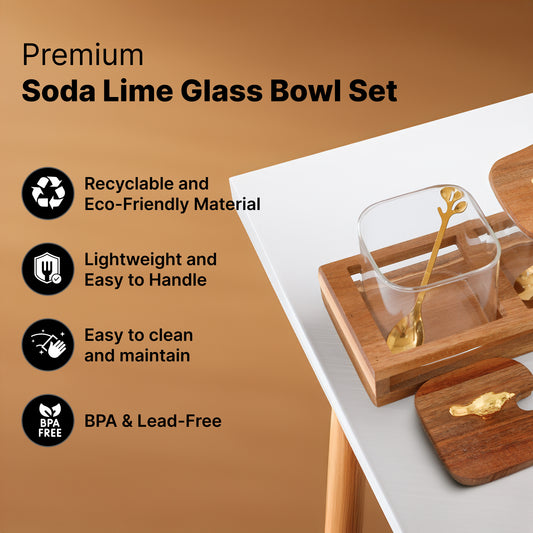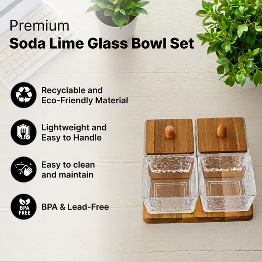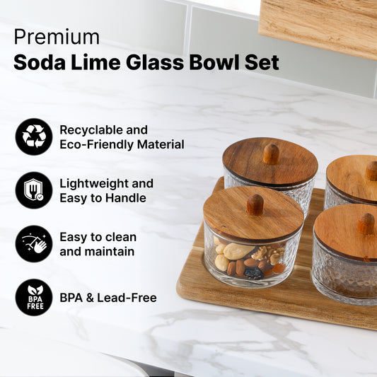 Platters Serving Set for Snacks | Premium Soda Lime Glass Bowls With Wooden Tray | 180ml | Transparent