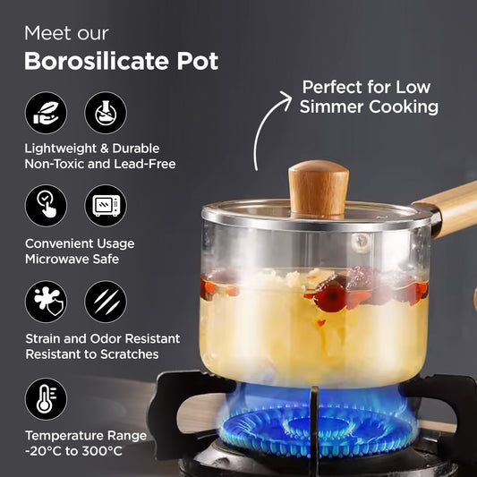 Borosilicate Glass Cookware for Gas Stove (1.45L) Saucepan with Handle | Electric Pottery Stove Cookware | Handi for Cooking | Microwave Safe | Milk Pan | Sauce Pan for Tea with Long Handle