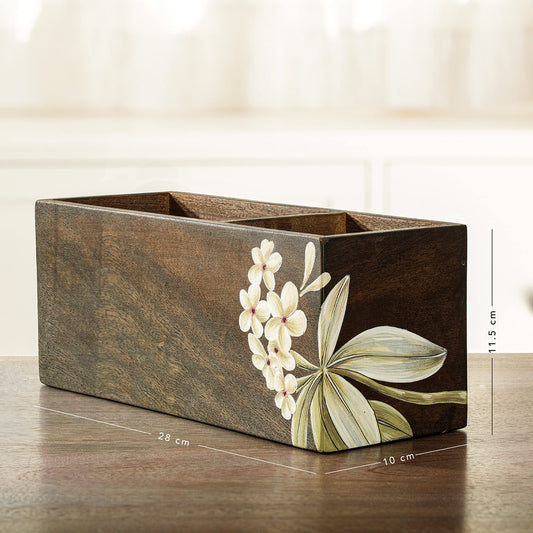 Frangipani Wooden Cutlery Holder | Premium Spoon, Knife and Fork Stand for Dining Table | Wooden Multipurpose Spoons Organizer for Kitchen | Handcrafted Tableware Storage Box