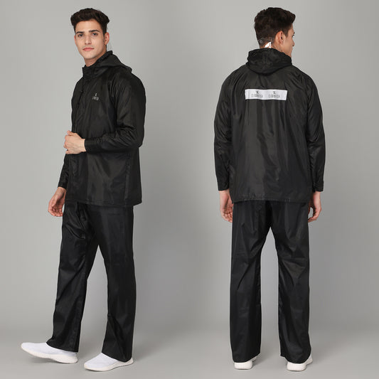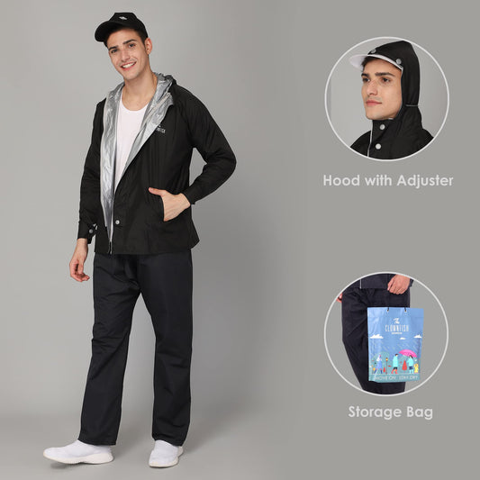 THE CLOWNFISH Road Rider Men's Waterproof Raincoat Polyester Double Coating Reversible Rain Suit with Hood & Inner Mobile Pocket. Set of Top and Bottom. Printed Plastic Pouch (Black, X-Large)