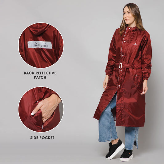 THE CLOWNFISH Polyester Long Length Raincoats For Women Raincoat For Ladies Waterproof Reversible Double Layer. Drizzle Diva Series (Maroon, Xx-Large)