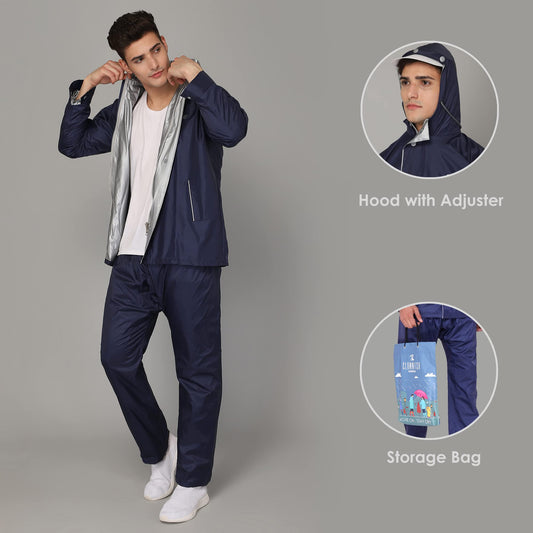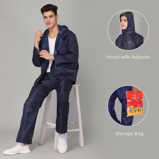 THE CLOWNFISH Road Rider Men's Waterproof Formal Raincoat Polyester Double Coating Reversible Rain Suit With Hood&Inner Mobile Pocket. Set Of Top&Bottom. Printed Plastic Pouch (Navy Blue,Xxx-Large)