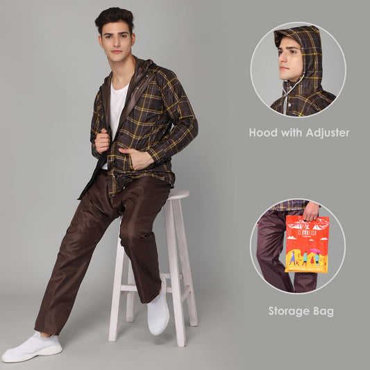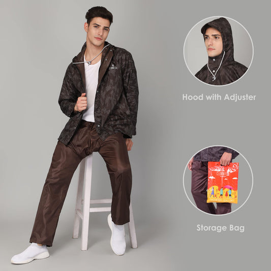 THE CLOWNFISH Rain Coat for Men Waterproof Raincoat with Pants Polyester Reversible Double Layer Rain Coat For Men Bike Rain Suit Rain Jacket Suit Inner Mobile Pocket with Storage Bag (Brown XL)