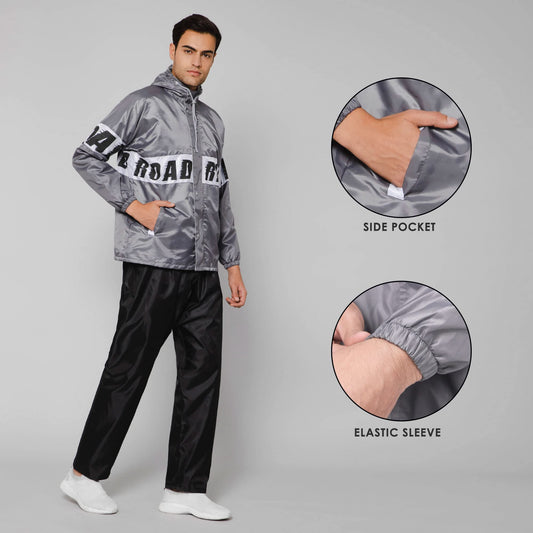 THE CLOWNFISH Road Rider Men's Waterproof Raincoat Polyester Double Coating Reversible Rain Suit with Hood & Inner Mobile Pocket. Set of Top and Bottom. Printed Plastic Pouch (Grey, X-Large)