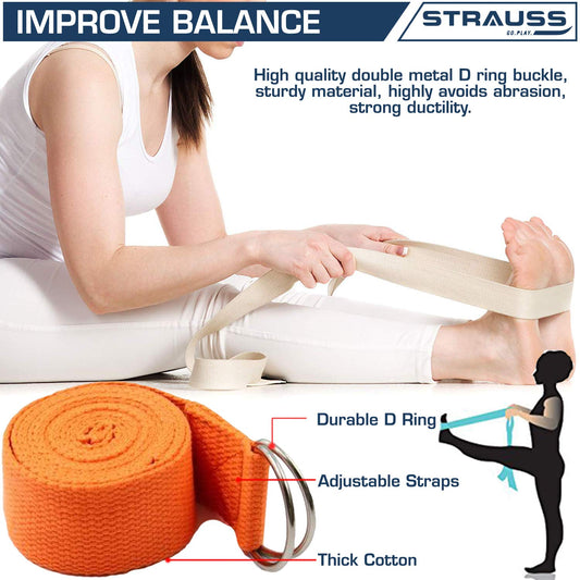Strauss Yoga Strap & Stretching Belt | Ideal for Yoga, Pilates, Therapy, Dance, Gymnastics & Flexibility | 60% Thicker Belt with Extra Safe Adjustable Metal D-Ring Buckle | Eco-Friendly, 8 feet (Orange)