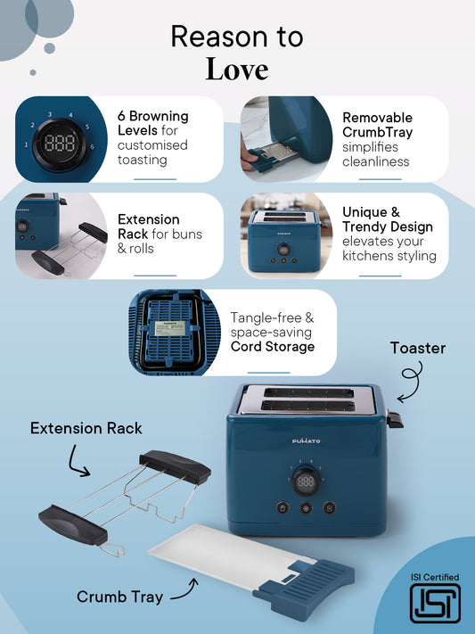 Pop Up Toaster 2 Slices - 1000W, 6 Browning Levels, Removable Crumb Tray | Stainless Steel | Midnight Blue