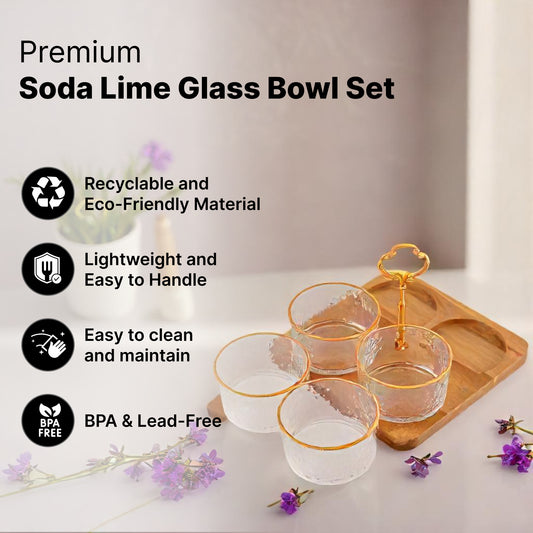 UMAI Platters Serving Set for Snacks with Wooden Tray & 4 Jars (150ml Each) | Premium Soda Lime Glass | Snacks Serving Bowls with Tray | Serving Tray with Bowls for Snacks | Gift for Housewarming
