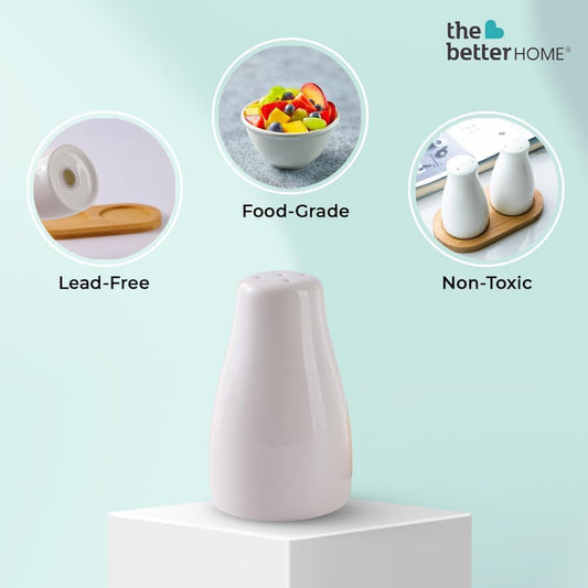 Ceramic Salt and Pepper Shakers Set (Pack of 1) with Wooden Tray | Dining Table Decorative Items | Salt Pepper Set for Dining Table | Salt and Pepper Shaker | White