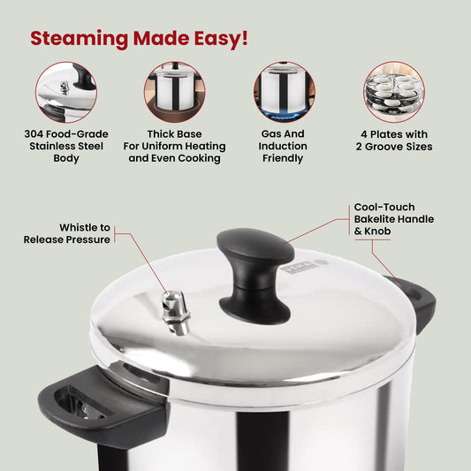 Idli Maker Stainless Steel | Induction & Gas Friendly | Idli Cooker with Stand | 4 Round Plates (16 idlis and 16 Button Idlis) + 3 Tri Plate (20 idlis)
