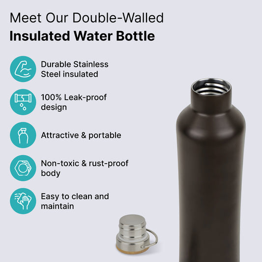 Insulated Water Bottle 1 L: Double Walled Stainless Steel | Black | Holder Included