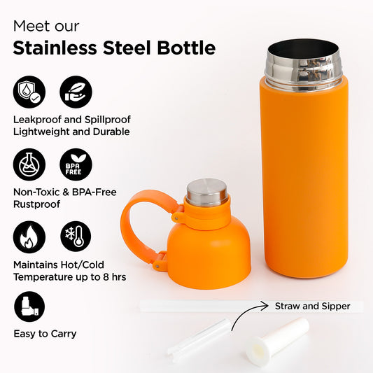 Insulated Double Walled Stainless Steel Water Bottle - Hot & Cold, Leakproof, BPA Free | 500ml | Orange