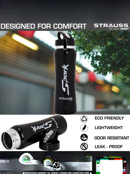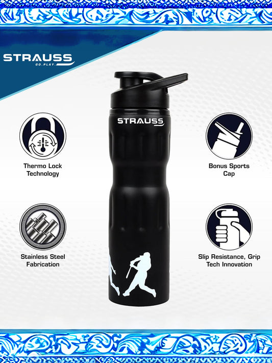 STRAUSS Stainless-Steel Water Bottle | Water Bottles for School, Office, Home & Gym | Leak Proof and BPA Free Gym Bottle | Easy to Carry | Water Bottle for Men & Women | 750 ML, (Black)