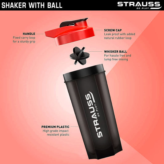 Strauss Recharge Shaker Bottle | BPA-Free Protein Shaker with Blender Ball | Leak-Proof Gym Bottle for Protein Shakes | Gym Bottle for Men and Women | Ideal for Gym, Yoga & Running, (Black/Red)