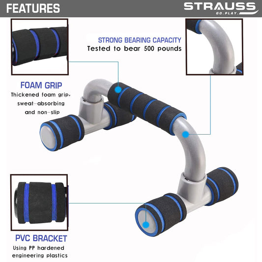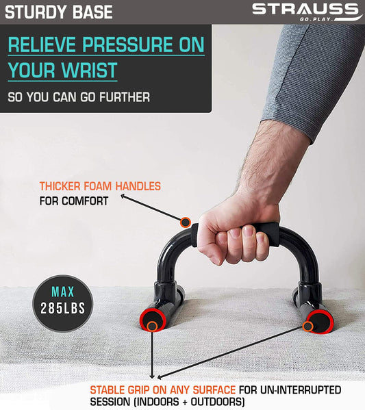 Strauss Moto Push-Up Bar, Pair |Non-Slip, Sturdy Exercise Equipment for Home or Gym Workout |Ideal for Upper Body Strength Training, Muscle Building, Push-Ups & Planks | Portable Gym Equipment,(Black)