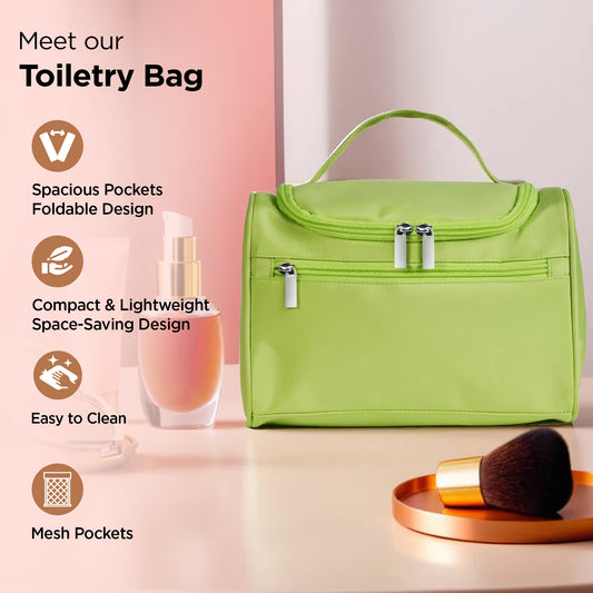 Space Saver Toiletry Bag with Hook | Travel Organizer Pouch | Hanging Dopp Kit for Men and Women | Open Bag 24x14x31cm | Waterproof | Green