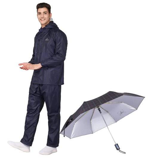 THE CLOWNFISH Polyester Combo Of Standard Length Rain Coat For Men Waterproof Polyester (Blue Xl) Umbrella 3 Fold Waterproof Pongee (Checks Design- Dark Pink)
