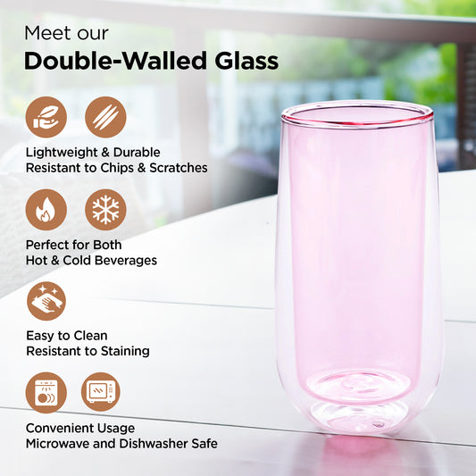 240ml Pink Double Wall Mug Set of 2 - Stylish, Durable Glass | Gift Pack