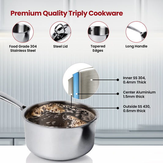 18cm Triply Stainless Steel Saucepan | 2.2L | Induction & Gas Friendly | Silver