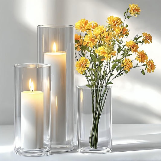 Cylindrical Glass Vase Set | Transparent Glass Flower Vases for Home Decor & Water Plants | Glass Candle Holder | Glass Jar for Indoor Bamboo, Money Plants, Etc. (Set of 3-8,6,4 Inch)
