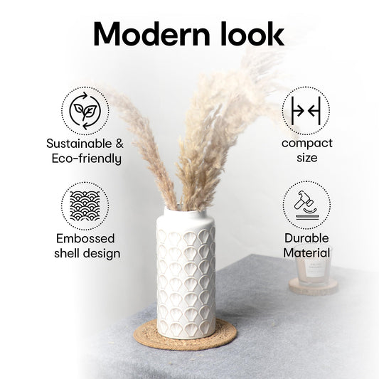 Shell Embossed White Ceramic Flower Vases for Home Decor | Flower Vase for Living Room, Bedroom, Office | Show Pieces for Home Decor, Houswarming Gifts for New Home | 25x11.5cm