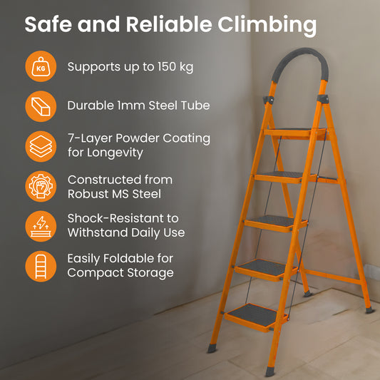 Cheston Foldable GI Steel 5-Steps Home Ladder | 5.6 Feet Anti-Skid Step Ladder with Wide Pedal & Hand Grip | Shock-Resistant Foldable Ladder for Home Use | Supports 150+ Kgs | Orange 5 Step