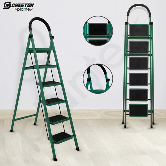 Cheston Foldable Stainless Steel 6-Steps Home Ladder | 6.1' FT Anti-Skid Step Ladder with Wide Pedal & Hand Grip | Shock-Resistant Foldable Ladder for Home Use | Supports 150+ Kgs | Green