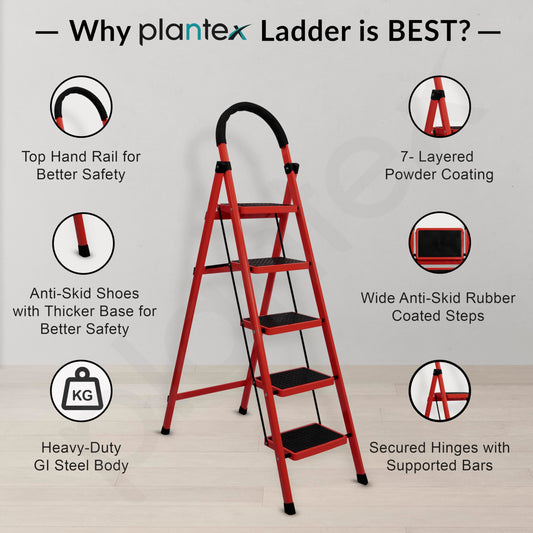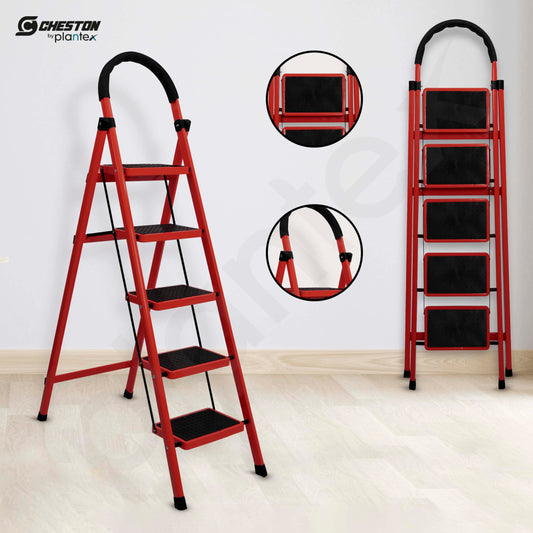Cheston Foldable GI Steel 5-Steps Home Ladder | 5.6 Feet Anti-Skid Step Ladder with Wide Pedal & Hand Grip | Shock-Resistant Foldable Ladder for Home Use | Supports 150+ Kgs | Red 5 Step (5 Step)