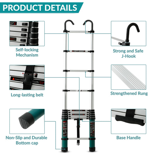 2.9m Aluminium Telescopic Ladder with Removable Hooks | Green | 10-Steps
