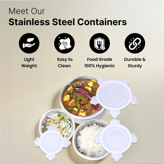 Combo: UMAI Lunch Box Tiffin Box - Steel, Leak Proof | Pack of 3 | 250ml, 400ml, 900ml | Silver
