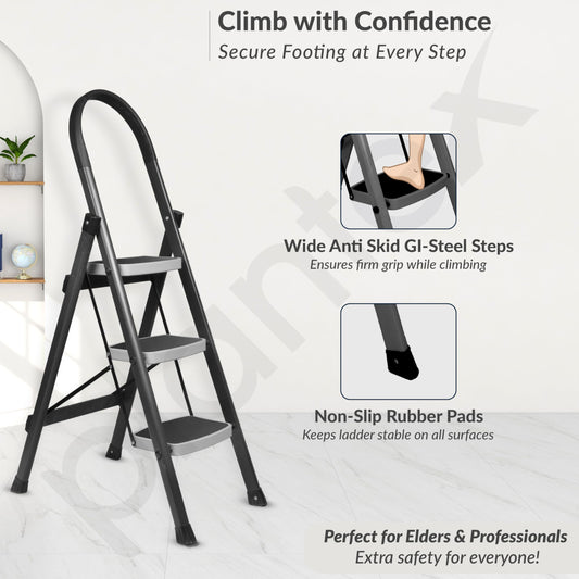 Viewing3 Step Ladder for Home - Foldable Steel 3 Step Ladder-Wide Anti Skid Steps - Space-Saving (Grey & White)
