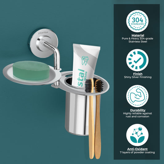 304 Grade Stainless Steel 2in1 Soap Dish with Tumbler Holder/Soap Stand/Tooth Brush Holder/Bathroom Accessories - Niko (Chrome)