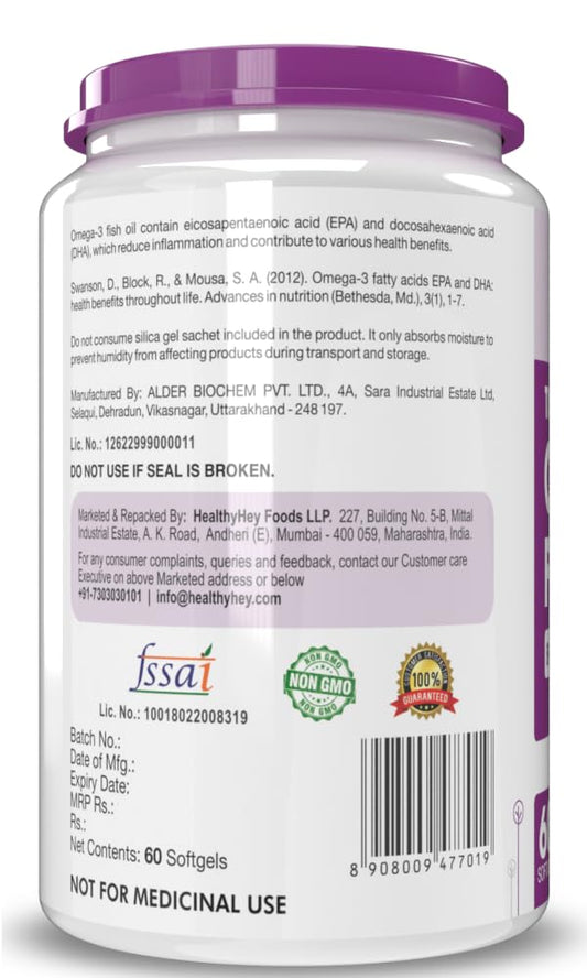 HealthyHey Nutrition Fish Oil Omega 3 60 Softgel For Women and Men | Triple Strength Fish Oil | Burpless, EPA 600 - DHA 400 Supplement