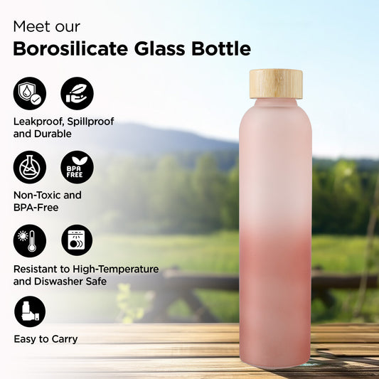 Water Bottle | Borosilicate Glass with Bamboo Lid | For Home, Office, and Travel Use | Leak Proof, Dishwasher Safe | 750ml | Gradient Light Pink-Dark Pink Water Bottle for Fridge