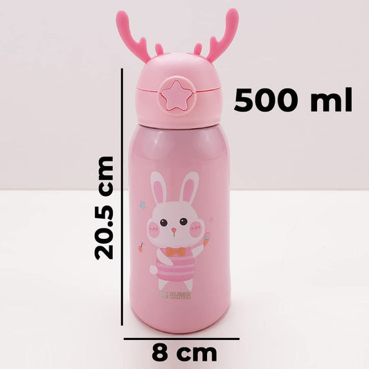 Kuber Industries Water Bottle for Kids|Bunny Design Stainless Steel Flask with Straw, Cup & Fabric Cover|Sipper Bottle for Kids|Food Grade Plastic Lid|Broad Fabric Strap|Leak Proof, BPA Free|500 ml