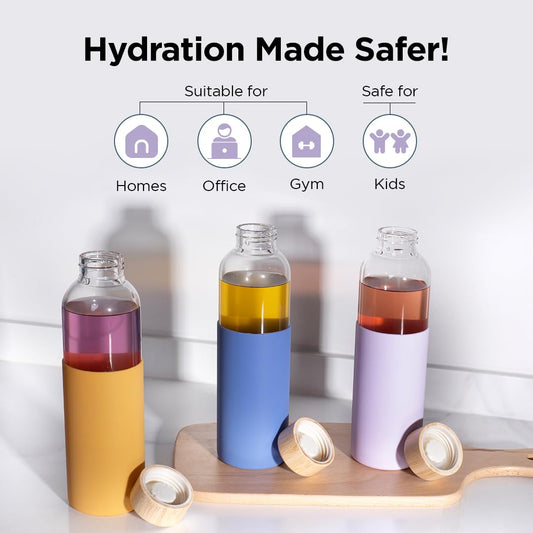 Borosilicate Glass Water Bottle with Sleeve 550ml | Non Slip Silicon Sleeve & Bamboo Lid | Fridge Water Bottle For Home & Office (Purple-Yellow, Pack of 2)
