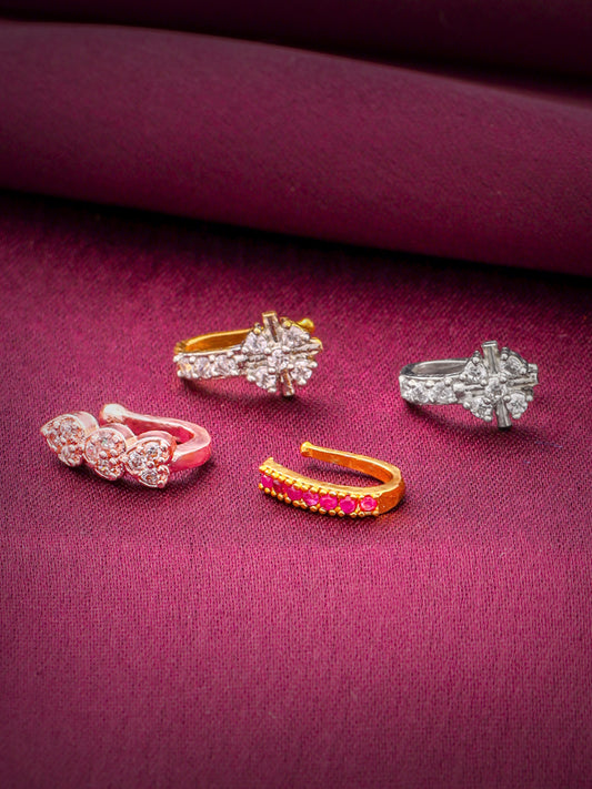 Nose Pins for Women Set of 4 Nose Rings Gold Silver Plated Traditional American Diamond Clip-On Nose Pins for Women and Girls.