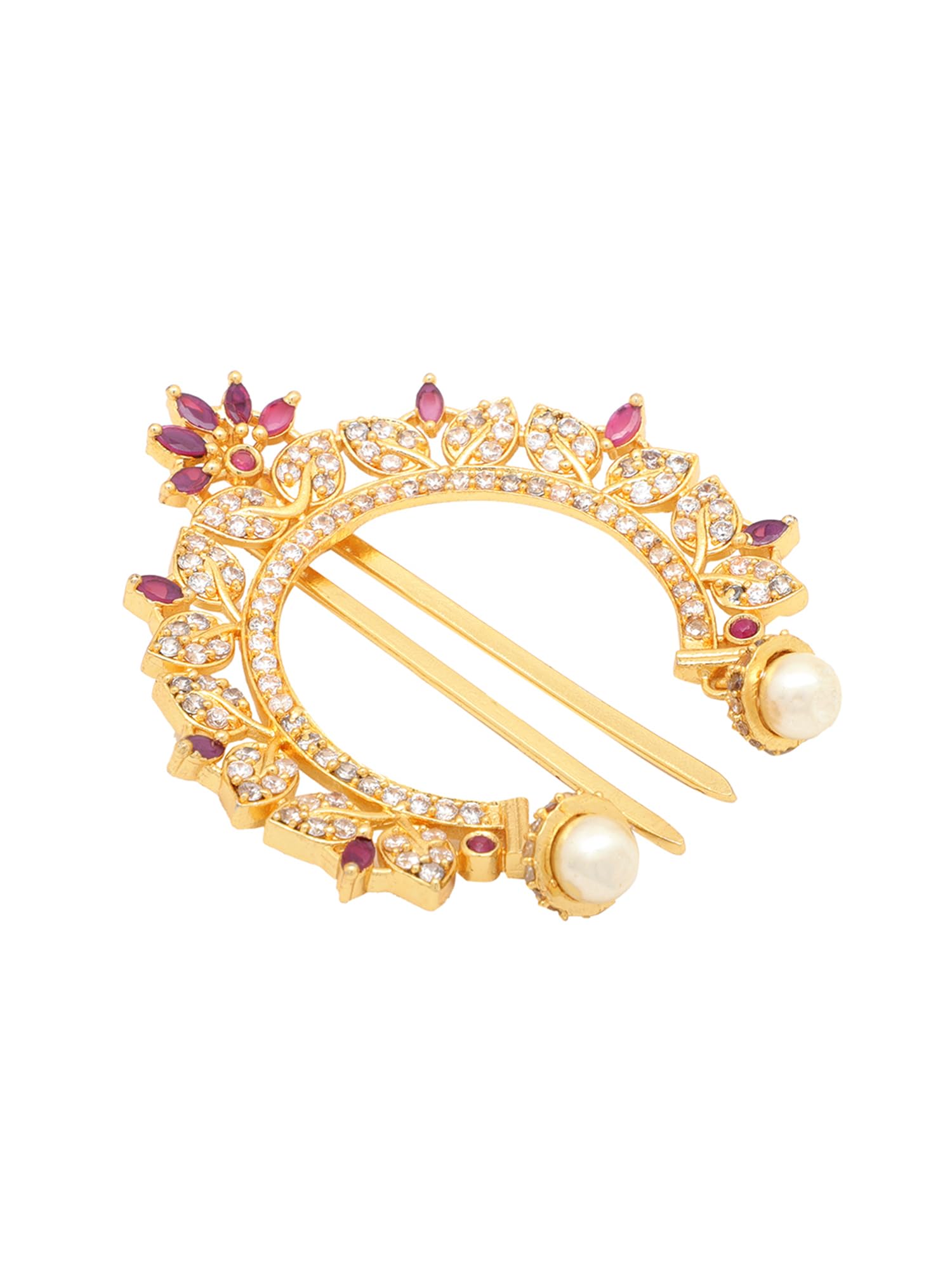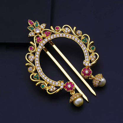 - ELEGANT DESIGN: Adorned with intricate floral patterns and shimmering AD stones, this juda pin is both traditional and contemporary.