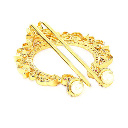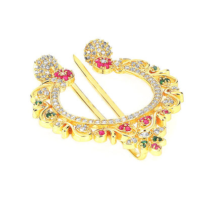 Introducing the Juda Pin for Women by Yellow Chimes, a stunning hair accessory designed to add elegance to your bridal hairstyle. This 1-count juda pin measures 4.6 CM in diameter and features a beautiful flower design adorned with high-grade multicolour AD stones. Expertly crafted using 18K Micro Gold Plating, this juda pin is durable and resistant to tarnishing, ensuring you look your best on your special day.