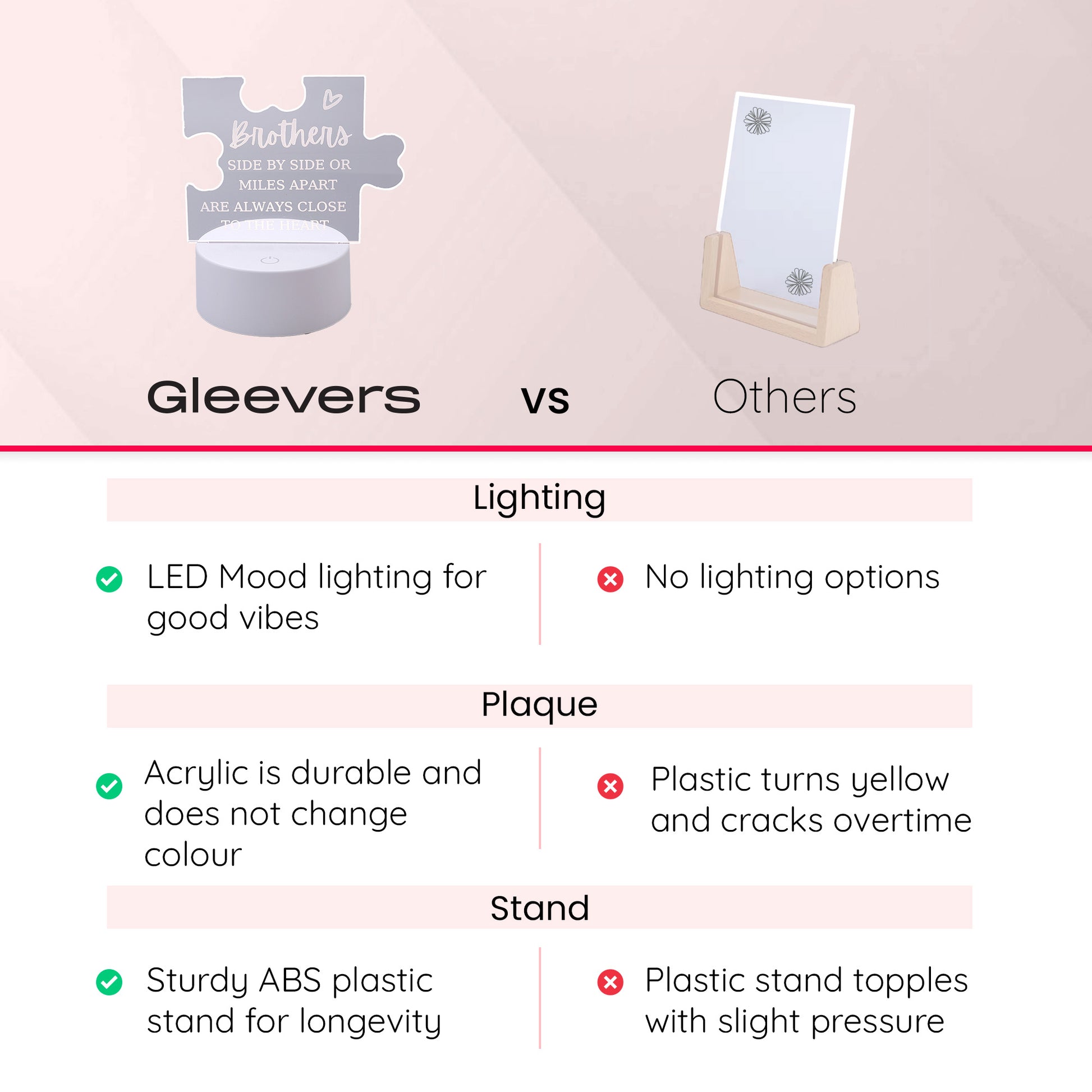 The Gleevers Acrylic Plaque is an excellent gifting option for brothers, best friends, family members, or any loved ones who appreciate thoughtful and creative gifts. Show your affection and make their day extra special with this one-of-a-kind LED light plaque that will surely be cherished for years to come!