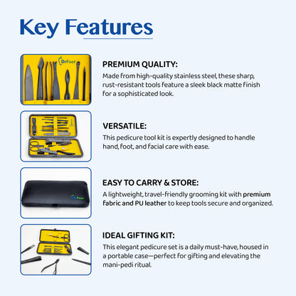 Introducing the Dr Foot 12 in 1 Pedicure Kit, your ultimate solution for perfect nails and rejuvenated feet. This versatile grooming kit includes 12 meticulously crafted stainless steel tools designed to meet all your manicure, pedicure, and facial care needs. With a stylish yellow travel case, this kit is not just about functionality; it’s also about style!
