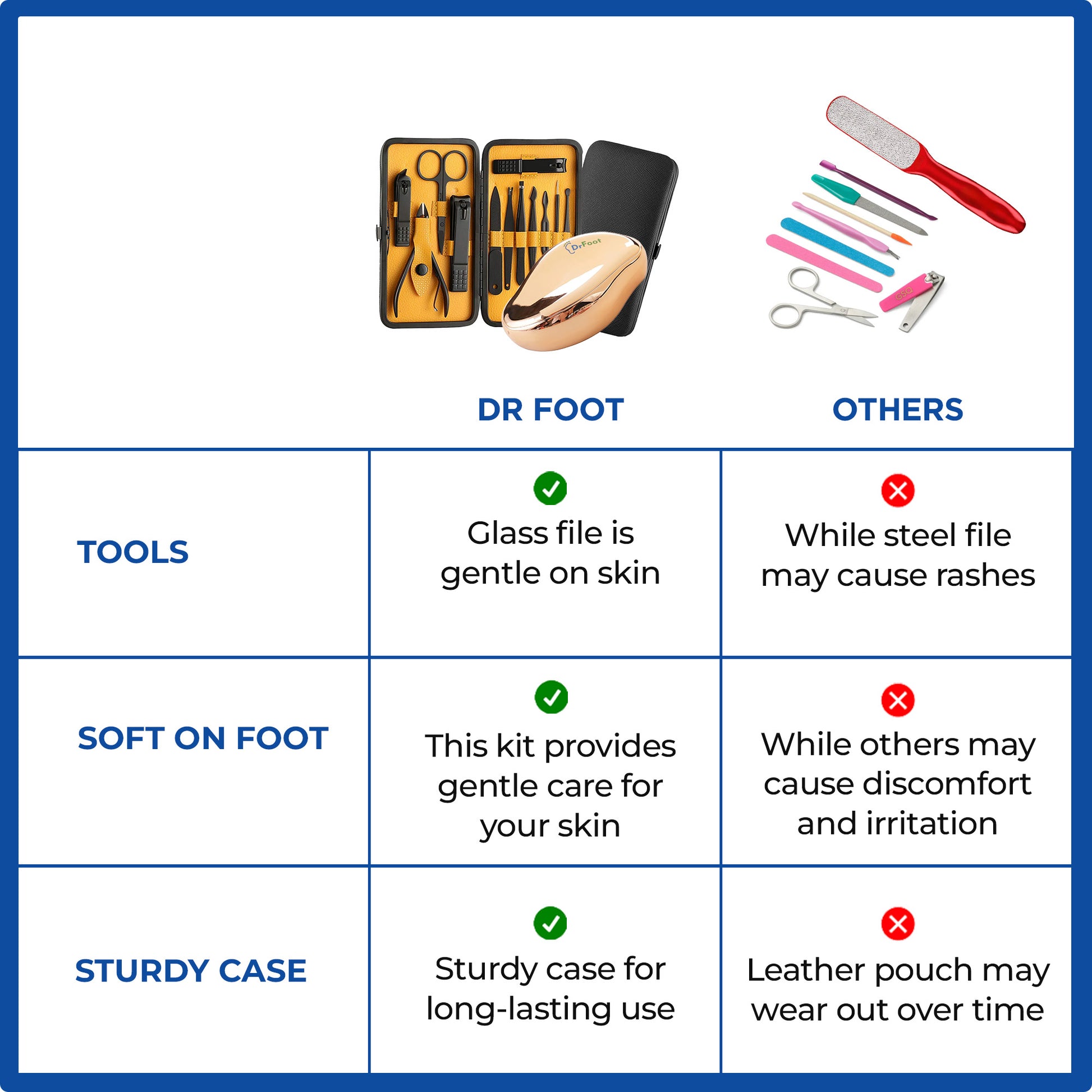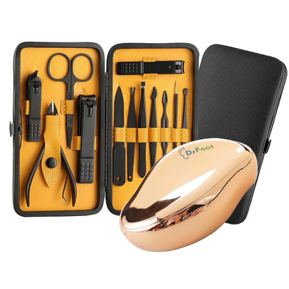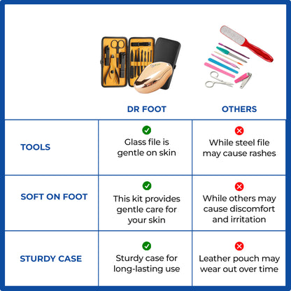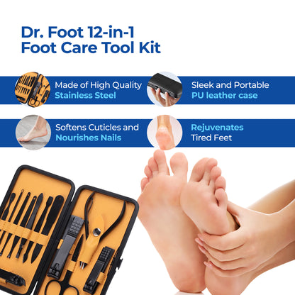 Introducing the 12-in-1 Pedicure Kit by Dr Foot, your ultimate solution for maintaining beautiful and healthy feet. This professional grooming kit includes 12 high-quality stainless steel tools designed to address various foot care needs. The elegant Rose Gold color adds a sophisticated touch to your grooming routine.
